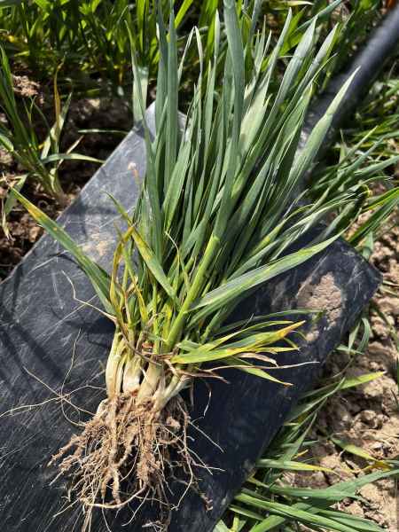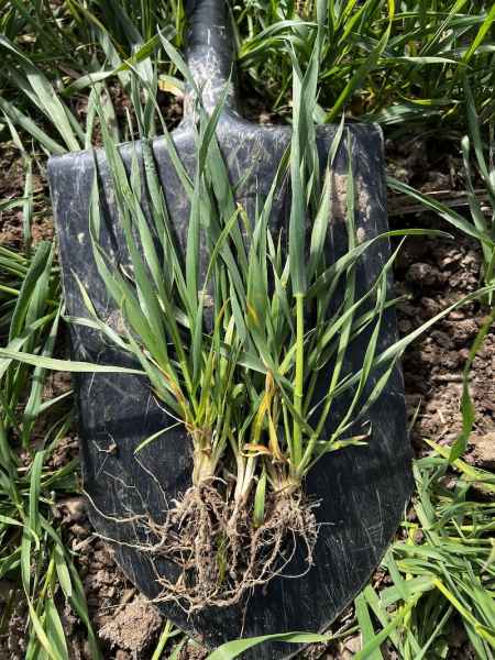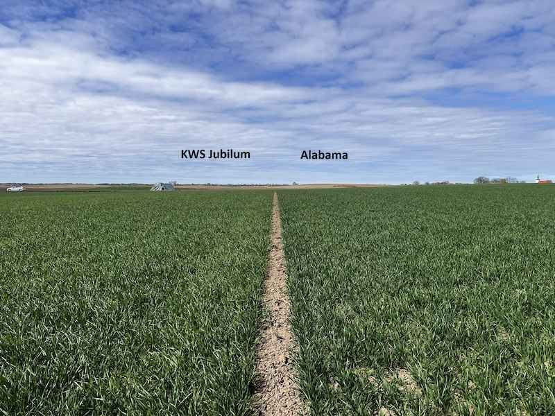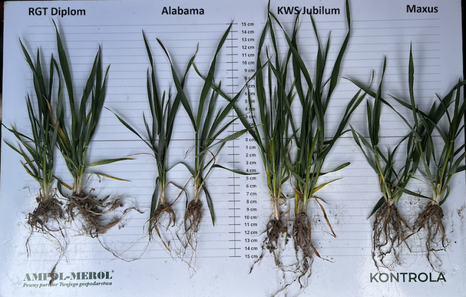 - Zdrowotność: Na dolnych piętrach liści odnotowano niewielkie ogniska mączniaka prawdziwego zbóż i traw. Presja patogenu jest najbardziej widoczna na odmianach Alabama oraz KWS Jubilum. Dzięki szybkiej reakcji i wykonaniu zabiegu T1 dzień przed naszą wizytą, rozwój choroby zostanie skutecznie wyhamowany.