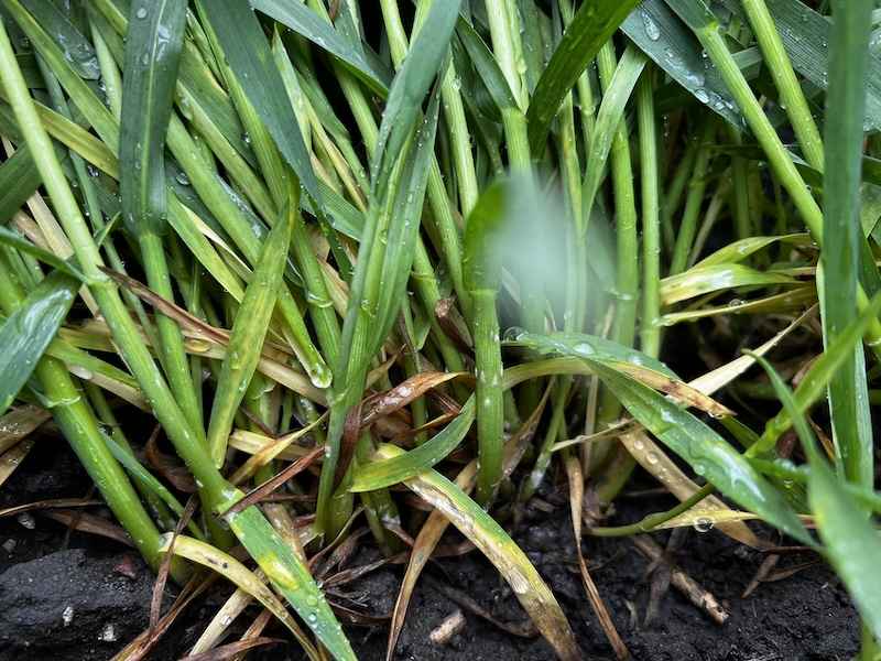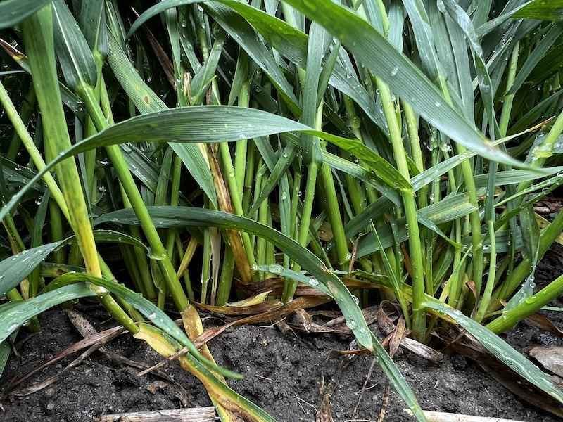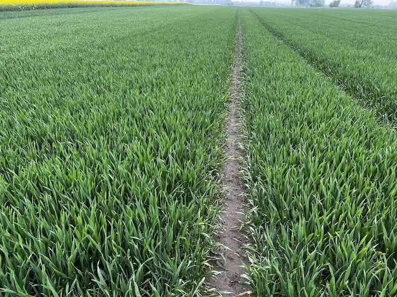 Na plantacji zbóż w Obłaczkowie widoczne były ślady żerowania skrzypionek – najprawdopodobniej skrzypionki zbożowej, choć możliwa jest również obecność skrzypionki błękitek. Z agrotechnicznego punktu widzenia nie ma to jednak większego znaczenia, gdyż oba gatunki zwalcza się w ten sam sposób. Tydzień wcześniej, podczas zabiegu T1, dodano do mieszaniny pyretroid. Dzięki temu podczas naszej wizyty nie zaobserwowaliśmy już obecności tego szkodnika.