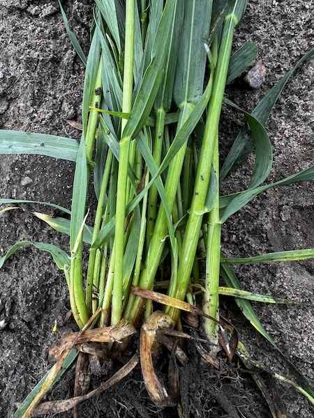 Zabieg fungicydem Boogie Xpro (1,5 l/ha) został wykonany 5 dni przed naszą wizytą. W związku z tym zakładamy, że zaobserwowana przez nas wysoka zdrowotność plantacji utrzyma się jeszcze przez około trzy tygodnie. Jedyną jednostką chorobową zauważoną u podstawy źdźbła był mączniak prawdziwy zbóż i traw, którego obecność odnotowaliśmy już podczas pierwszej lustracji. Dzięki interwencyjnemu działaniu spiroksaminy zawartej w preparacie Boogie Xpro, rozwój grzybni został skutecznie ograniczony. Problem tej choroby w nieco mniejszym stopniu dotyczył odmian Alabama, RGT Diplom i Dubaj.