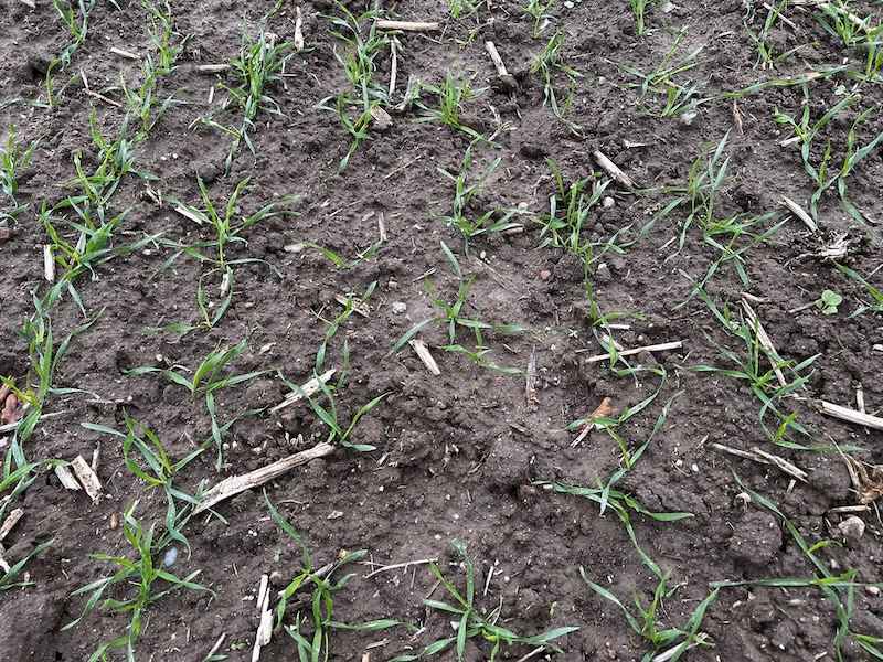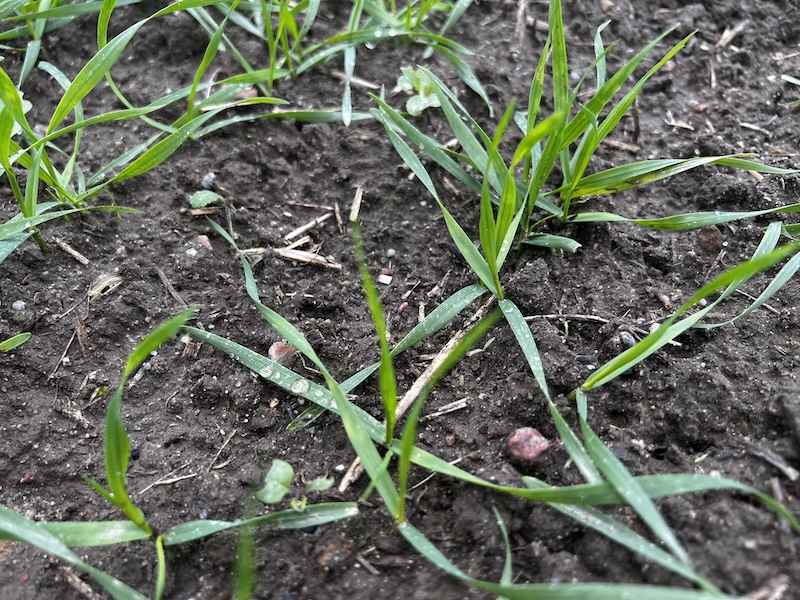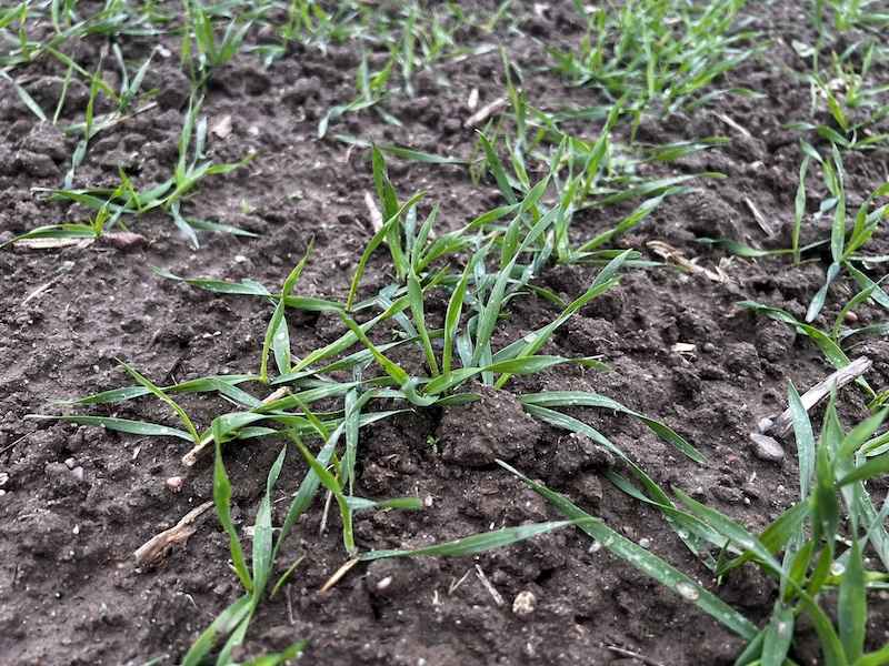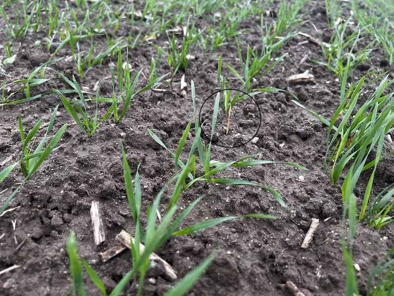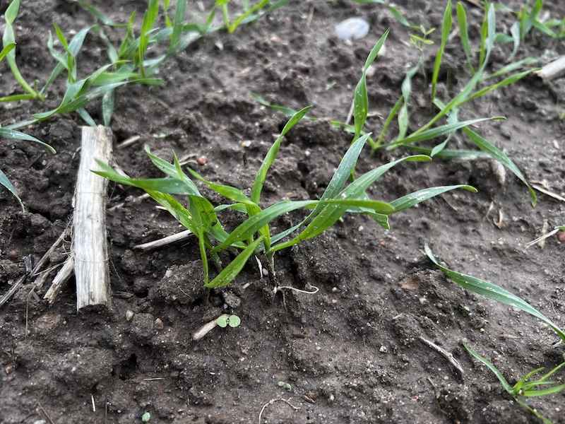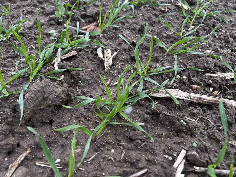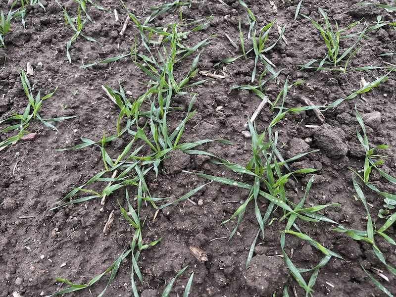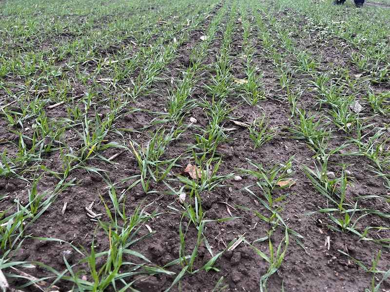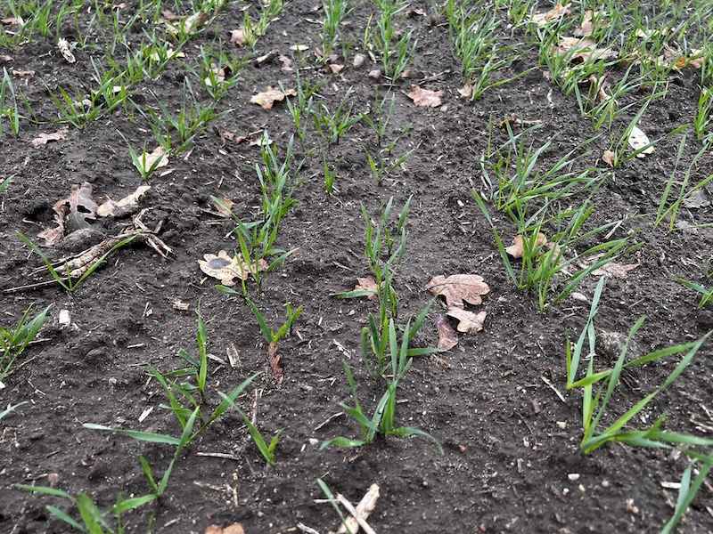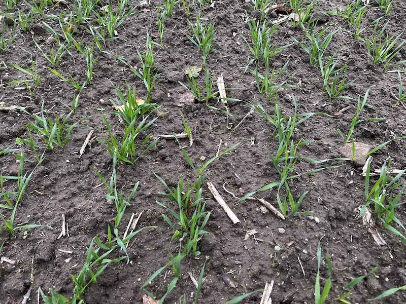 Pomimo pagórkowatego ukształtowania terenu, wschody były wyrównane i niemal stuprocentowe. Głębokość siewu była zachowana na jednakowym poziomie, ok. 3 cm.