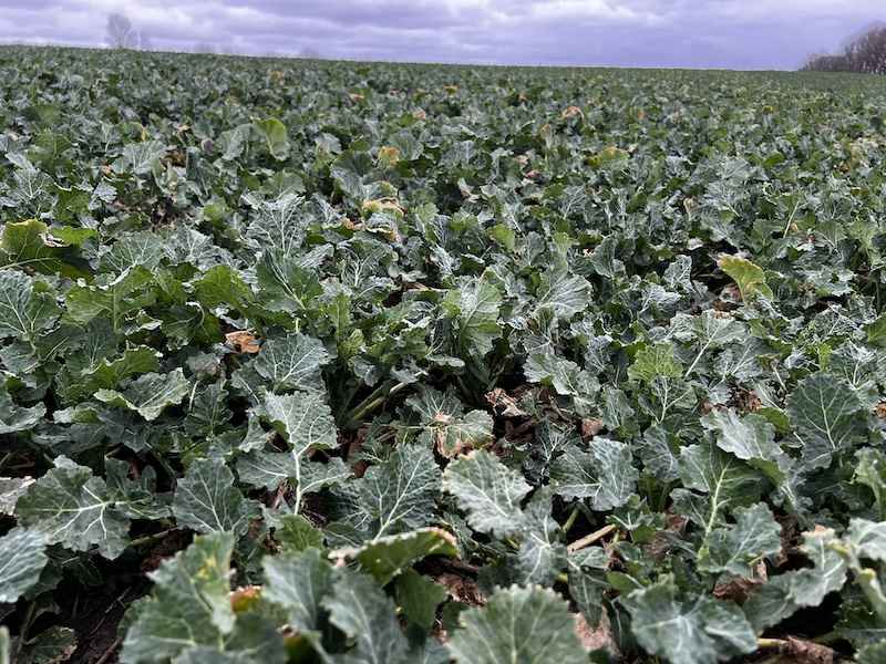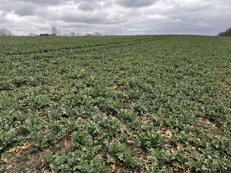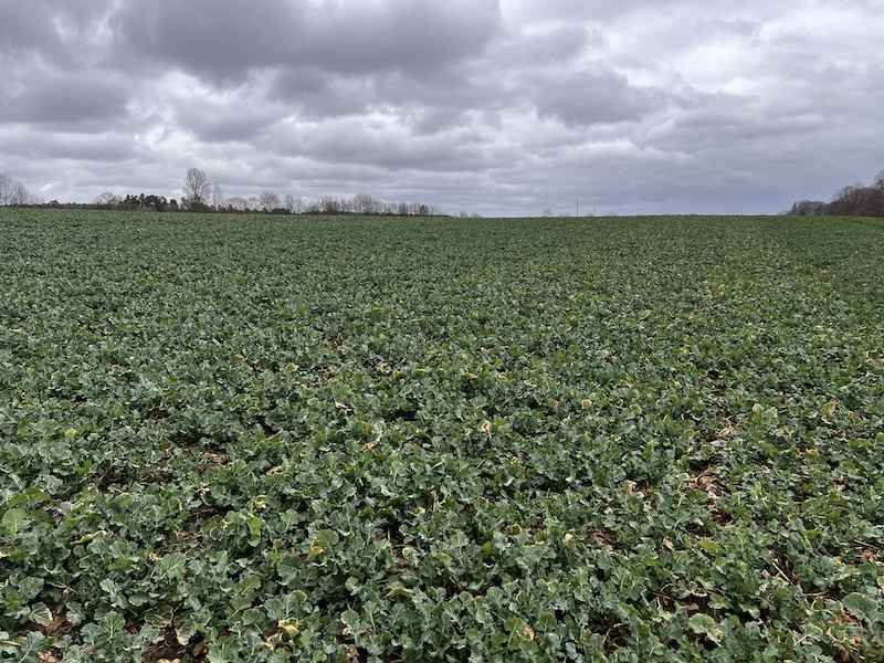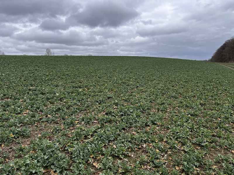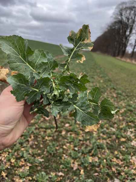 Bożenice to pierwsza tak silnie rozwinięta plantacja w tym sezonie. W dniu lustracji pąk wierzchołkowy najsilniejszych roślin był wyniesiony na 10 cm, a nawet nieco więcej. To jednoznaczny sygnał, że faza regeneracji rozety trwa, jednocześnie rzepak wszedł w fazę intensywnej elongacji pędu. Rozety są świetnie odbudowane, a liście soczyście zielone i wolne od jakichkolwiek objawów chorobowych.