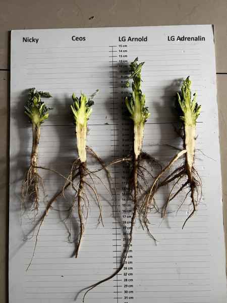 - Stabilny wzrost: Ceos oraz odmiana populacyjna Nicky nieznacznie ustępowały liderom pod kątem wysokości, jednak wszystkie odmiany miały w równym stopniu silnie rozwinięte zawiązki przyszłych pędów bocznych, co jest doskonałym prognostykiem dla plonowania.