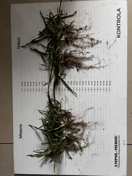 - System korzeniowy: To element, który najbardziej wyróżnia Polanów na tle innych lokalizacji. Rośliny posiadają wyjątkowo silny, głęboki i gęsty system korzeniowy. Jest to bezpośredni efekt jesiennego zastosowania produktu mikrobiologicznego Novobakt AzoFosfo, który udostępniając fosfor glebowy, stymulował budowę fundamentu rośliny już od momentu siewu.