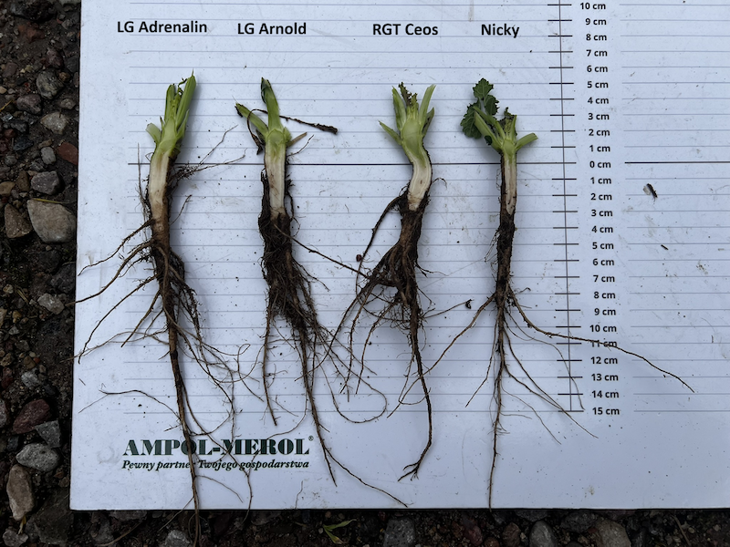 Pozostałe odmiany prezentują wyrównany wzrost i bardzo dobre parametry biometryczne – długość korzenia, grubość szyjki korzeniowej oraz wyniesienie pąka wierzchołkowego były na podobnym poziomie (szczegółowe dane przedstawione w tabeli poniżej).