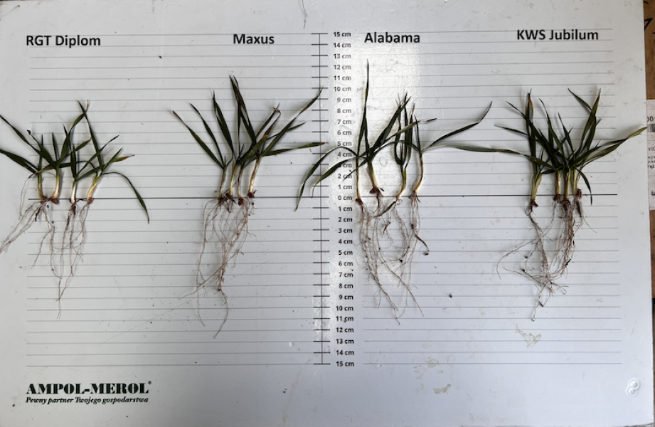 W Rogalinie odnotowaliśmy kluczową różnicę w zaawansowaniu faz rozwojowych pomiędzy badanymi kreacjami. Podczas gdy odmiany Maxus, RGT Diplom oraz Alabama znajdowały się jeszcze w fazie trzech liści (BBCH 13), odmiana KWS Jubilum jako jedyna weszła już w fazę krzewienia (BBCH 21).