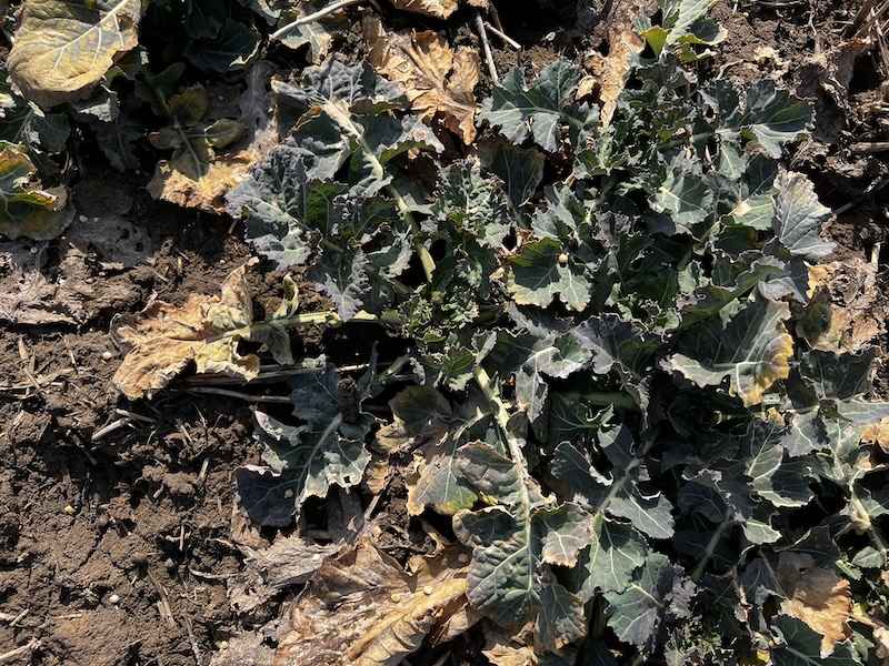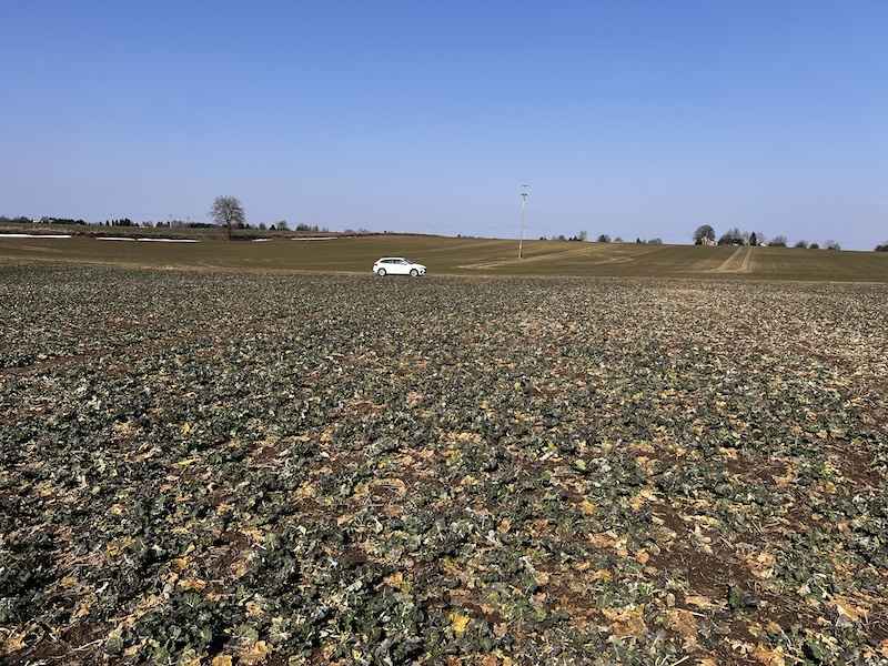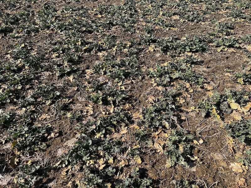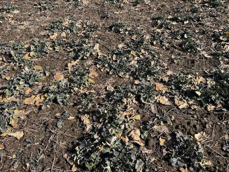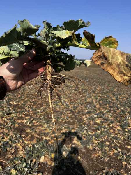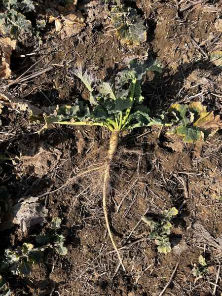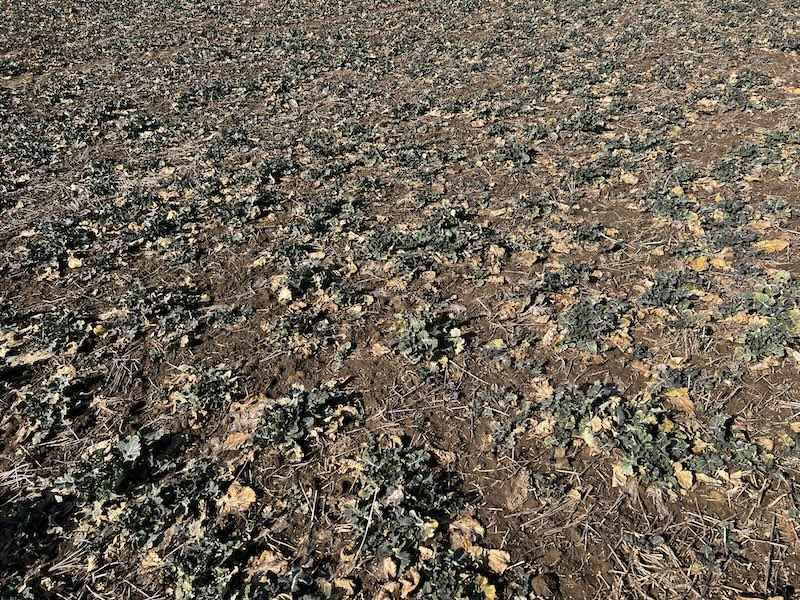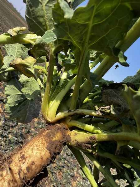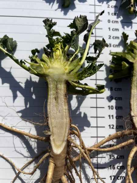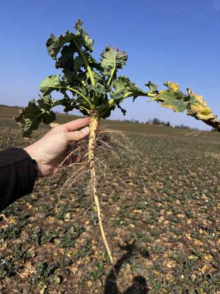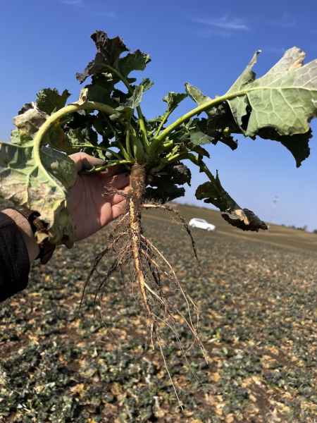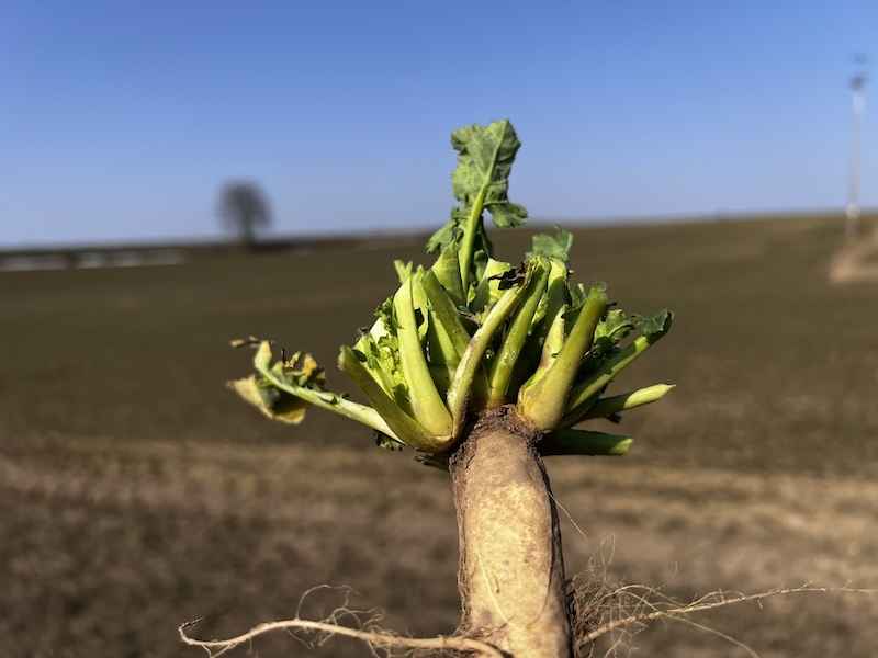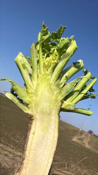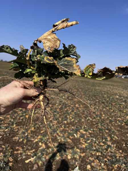 Pod kątem fitosanitarnym plantacja w Rogalinie jest niemal wzorcowa. Nie zaobserwowaliśmy żadnych objawów chorób grzybowych na liściach ani szyjce korzeniowej. Pole jest również całkowicie wolne od obecności chwastów, co potwierdza wysoką skuteczność jesiennego odchwaszczania.